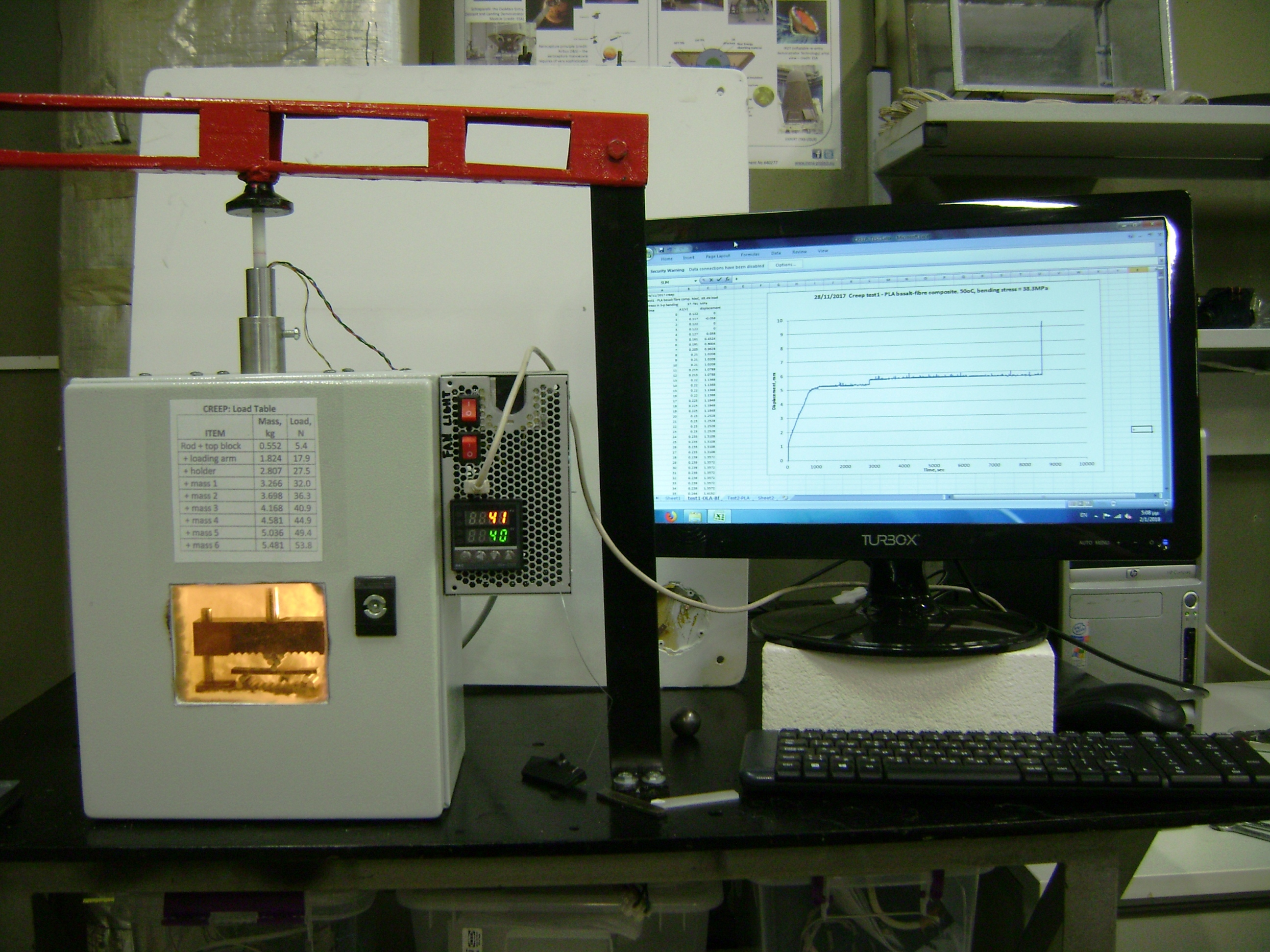 Creep is the slow deformation of materials under load at elevated temperatures and is used to characterise materials that are used under continuous loading. In our apparatus we can carry out creep testing under flexure of plastics and composites up to 200MPa and at temperatures up to 100oC, according to ASTM 2990. The deformation is recorded in real time for later analysis.